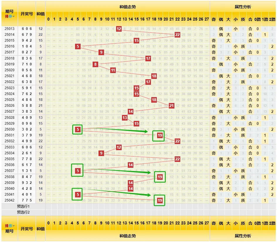 最近这个和值真的是搞逗了,好像有哪条法律规定和值5后面一定要出和值19样的,重复走了3次了,看到了你都不敢相信它会这么来,还有就是,从030期到042期里面,共13期,5的和值出现3次,19和值出现3次,14和值出现3次,22和值出现2次,9与12各一次,尽出这几个和值了,照这么算的话,今天9-12-22和值里必有一个...